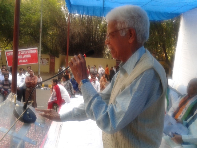 Thousands of central government employees participated in the Dhrna at Jantar Mantar,New Delhi on 19th November, 2015 protesting against the negative approach of the central government on their charter of demands. They slammed the government move to influence the 7th Pay Commission stating financial burden on the government. The Joint Action Committee of central Govt Employees leaders, including Com.Shiv Gopal Mishra, GS,AIRF, Com.M.Krishnan, SG, Confederation, Com.R.N.Parashar, SG,NFPE addressed. Representing the pensioners Com.V.A.N.Namboodiri, Patron, NCCPA and Advisor, AIBDPA also addressed the Dharna.