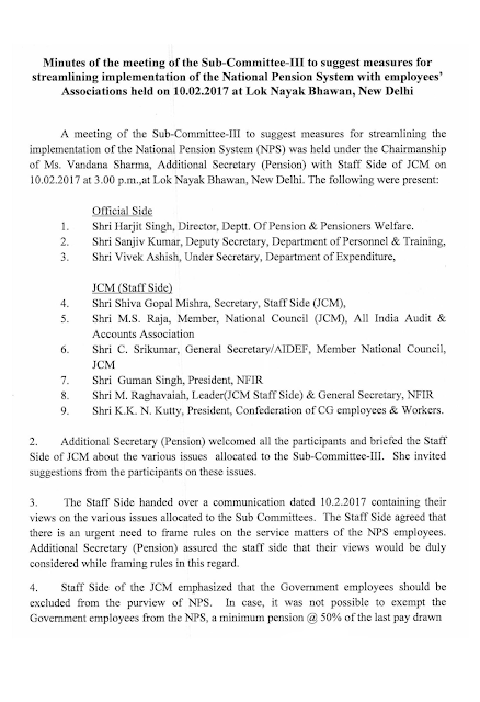Minutes of the meeting of the Sub-Committee-III to suggest measures for streamlining implementation of the National Pension System with employees’ Associations held on 10.02.2017 at Lok Nayak Bhawan, New Delhi