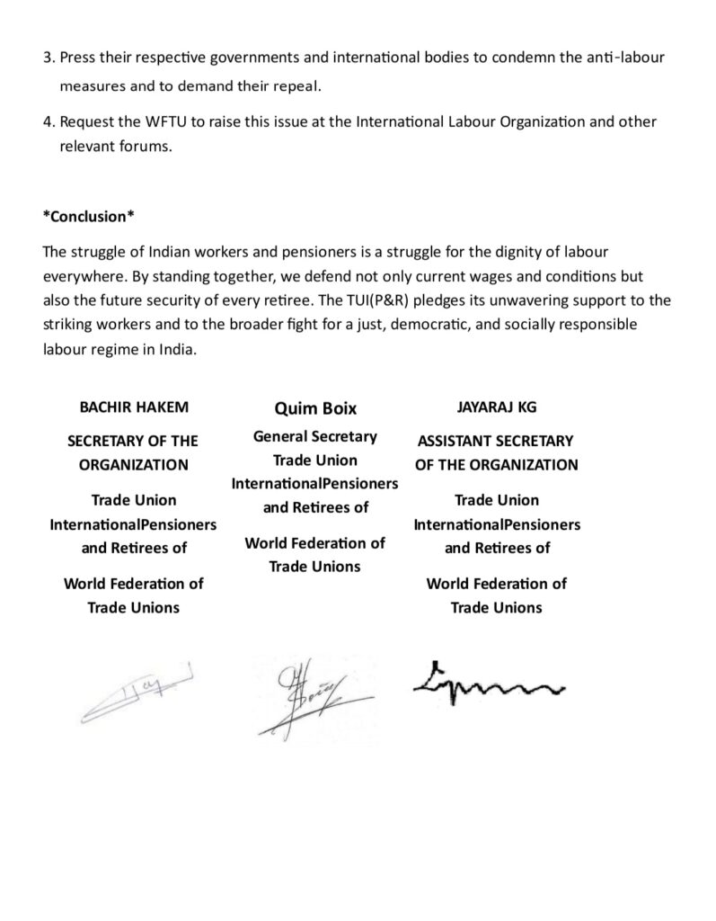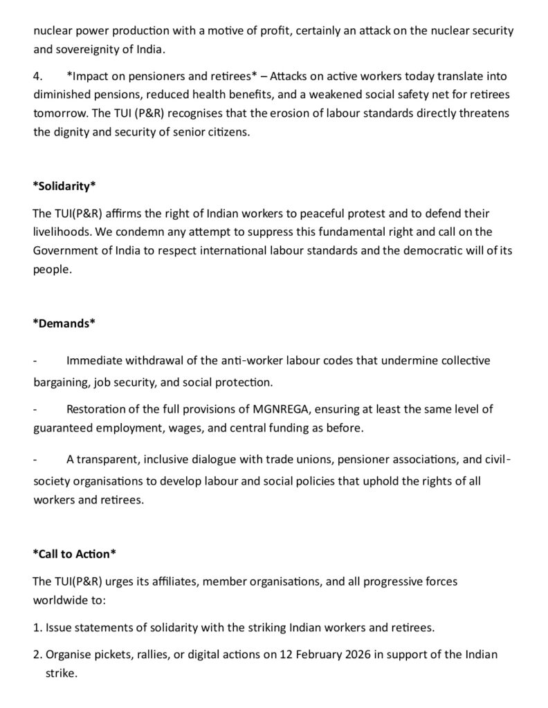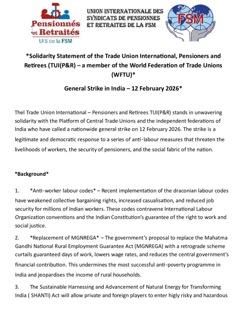 The International Women’s Day 2026 is to be celebrated on March 8 befittingly. The Trade Union International (Pensioners & Retirees) of WFTU has also given a call to celebrate it. The official theme for 2026 International Women’s Day is “Rights, Justice, Action” for all women and girls focusing on dismantling barriers to equal rights and justice for women and girls worldwide. Apart from this theme, United Nations is also focusing on “Give to Gain” campaign highlighting the power of giving support, opportunities, knowledge and resources to advance women’s empowerment. All CHQ Office bearers and Circle Secretaries may please take initiative to observe the Day in a befitting manner. The Day can be observed jointly with other like minded organisations according to the local conditions.